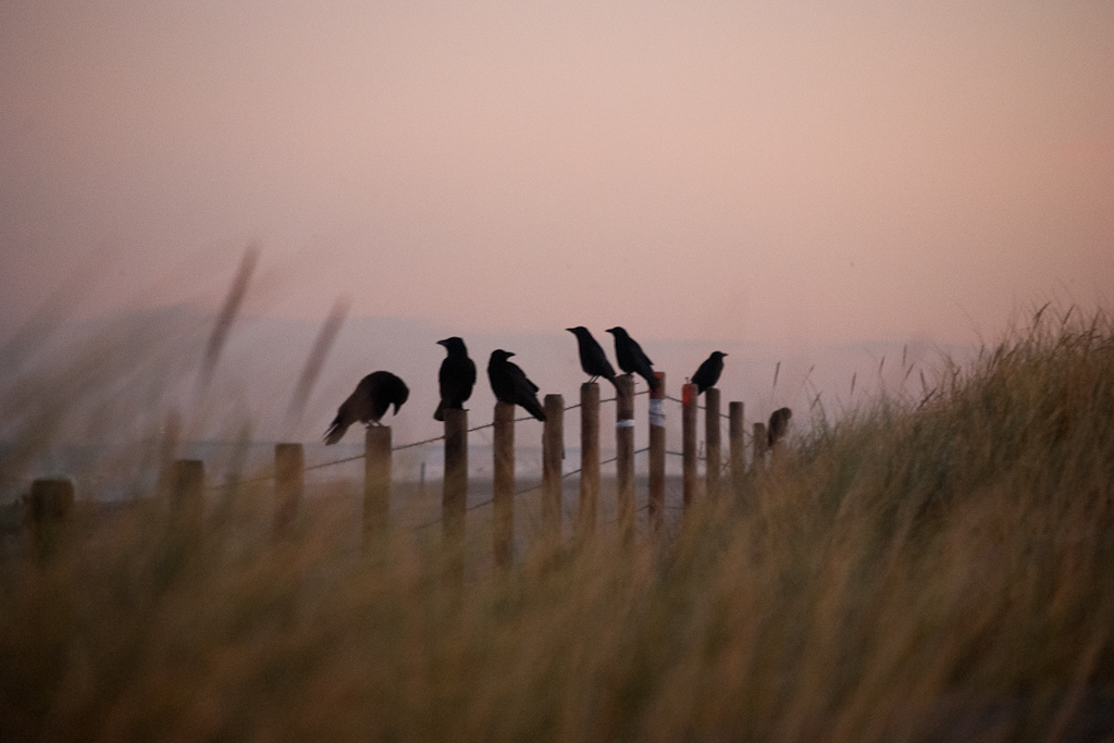 Because the weather forecast promised good weather, we cycled, still in the dark, to the beach, and when we put our bikes away, the sun peeped over the horizon in the east. Beautiful colours in the sky, the sea looked blue, and the air above the water a soft pink too. The crows sat waiting for their picture, those poles are made for them, or so they think.